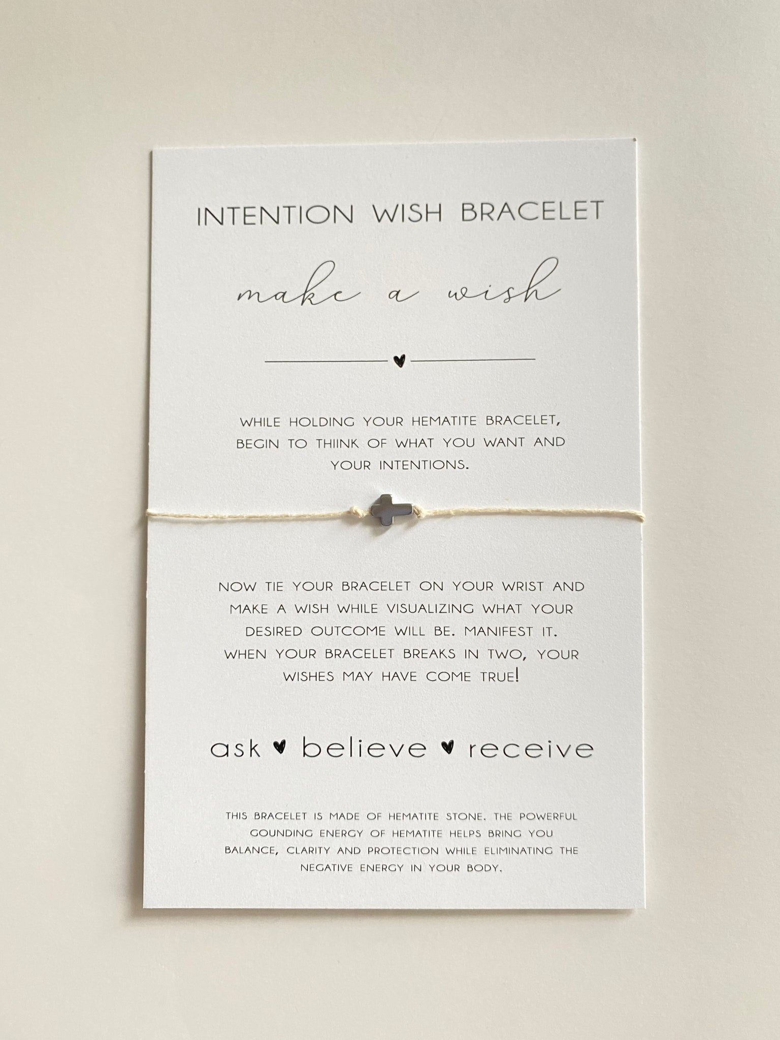 Our Intention Wish Bracelet is made with Hematite Stone. The powerful grounding energy of Hematite stone helps bring you balance, clarity and protection, while eliminating the negative energy in your body.